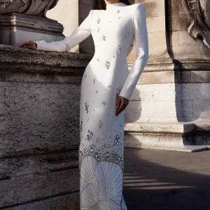 CÉCILE Robe longue de créateur à manches longues pour femme, luxueuse, ornée de cristaux, de diamants et de perles