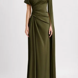 BIANCA Robe de soirée de couleur unie à col incliné avec manches aux épaules, taille plissée pour l’amincissement