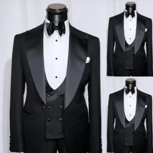 Costume de mariage noir de haute qualité, 3 pièces (veste, gilet et pantalon), coupe cintrée